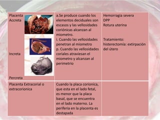 La dinámica del envejecimiento de la placenta durante semanas continúa más intensamente. Sin embargo la ingesta regular de vitaminas nutrientes y alimentos saludables que contienen antioxidantes puede detener el envejecimiento prematuro de la placenta. Diabetes mellitus yo hipertensión arterial sistémica lo cual condisiona al riesgo de presentar placenta previa una situación totalmente diferente al desprendimiento prematuro de placenta.