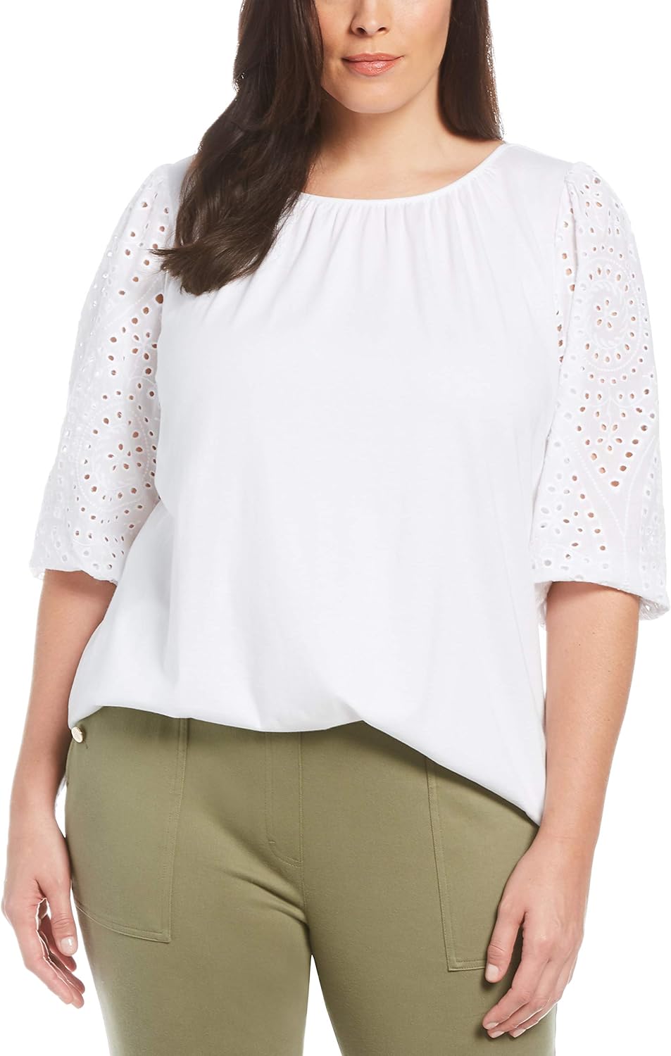 Three quarter sleeves side slits pullover style. Eyelet Mixed Media Sweater Tee. 34 quarter length sleeves.